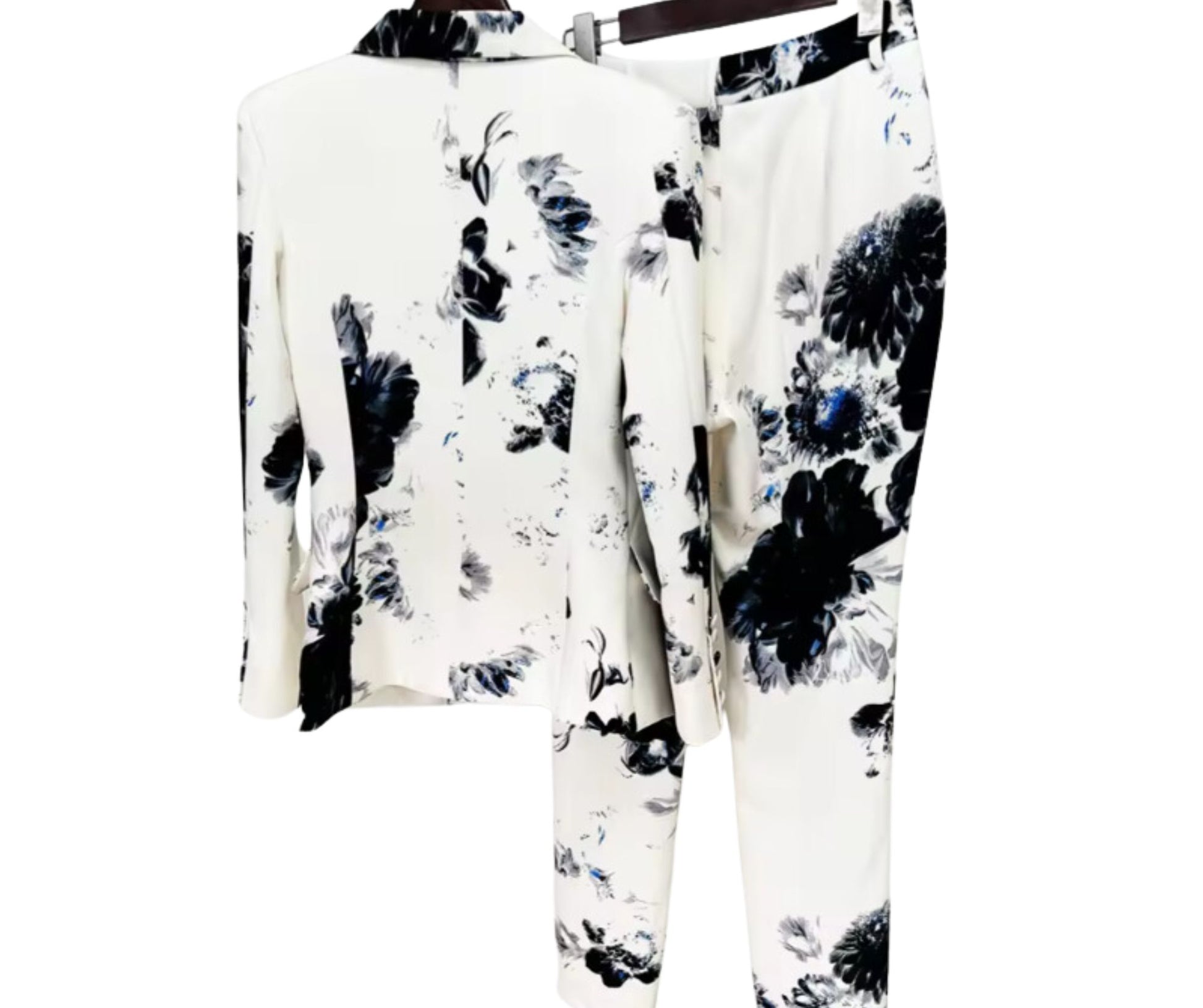 Pants: Accompanying the blazer are matching tailored pants, designed with the same floral motif for a cohesive and polished appearance. The pants feature a mid-rise waist and a straight-leg cut, providing comfort without compromising elegance.