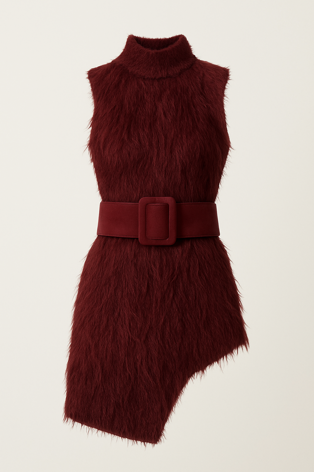 Unapologetically bold, the Cabernet Asymmetrical Textured Mini Dress is a statement in modern elegance. Crafted in a deep wine-red hue, this sleeveless piece features a plush, faux-fur texture that exudes both edge and sophistication. A sculptural mock neckline balances the striking irregular hemline, creating a silhouette that feels avant-garde yet wearable.