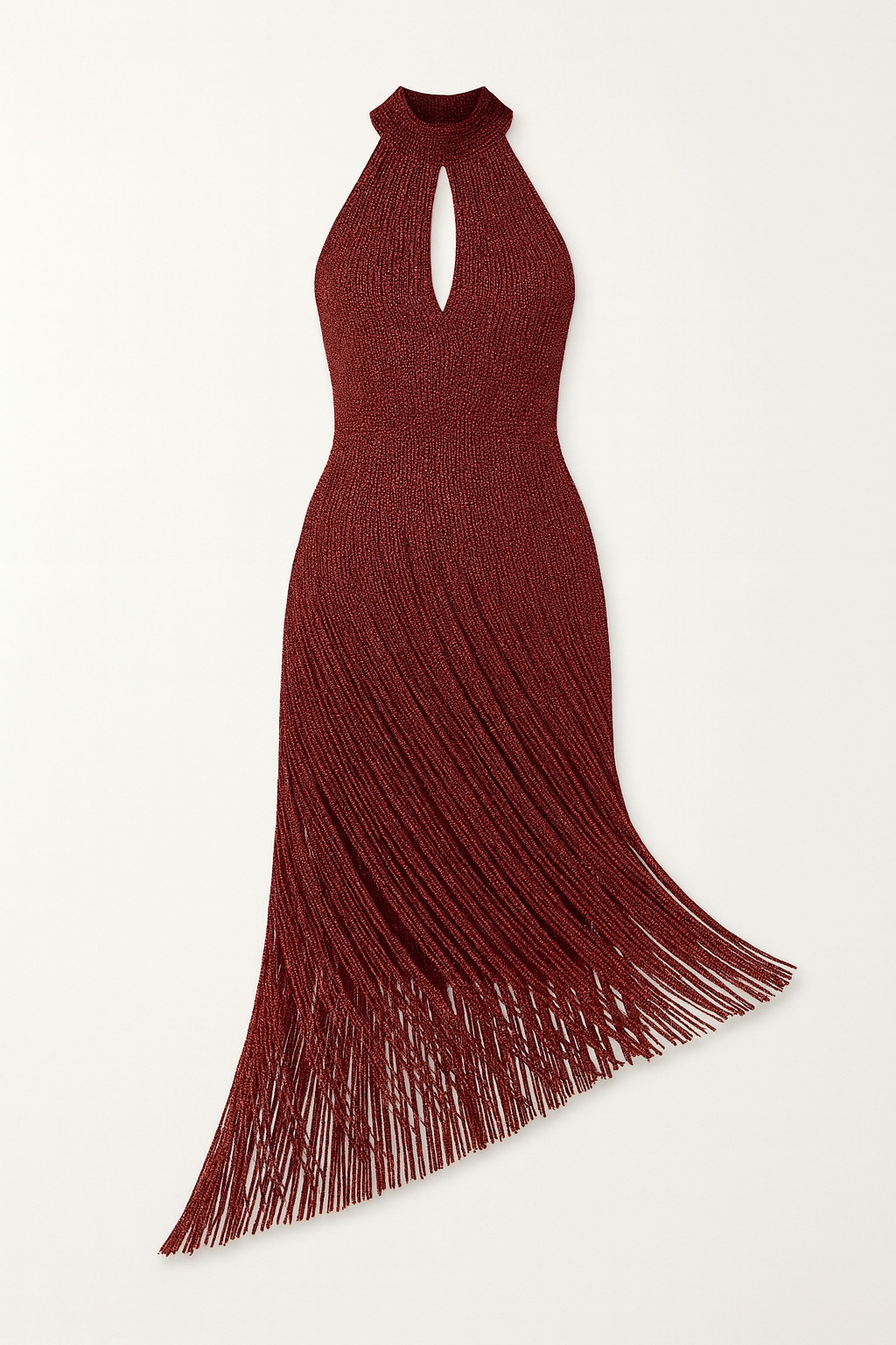 - Material: Metallic knit with flowing fringe hem