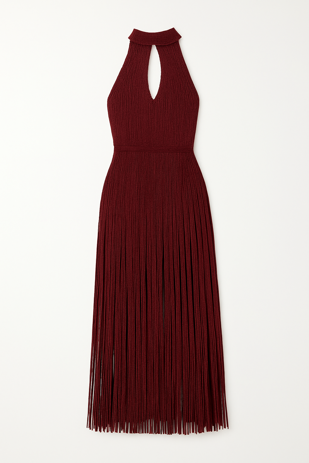 Where movement becomes art—the Cabernet Fringe Halter Gown captures the essence of modern glamour with effortless allure. Rendered in a rich wine-red hue, the gown is crafted from a shimmering knit that sculpts the body with precision before cascading into a symphony of free-flowing fringe.