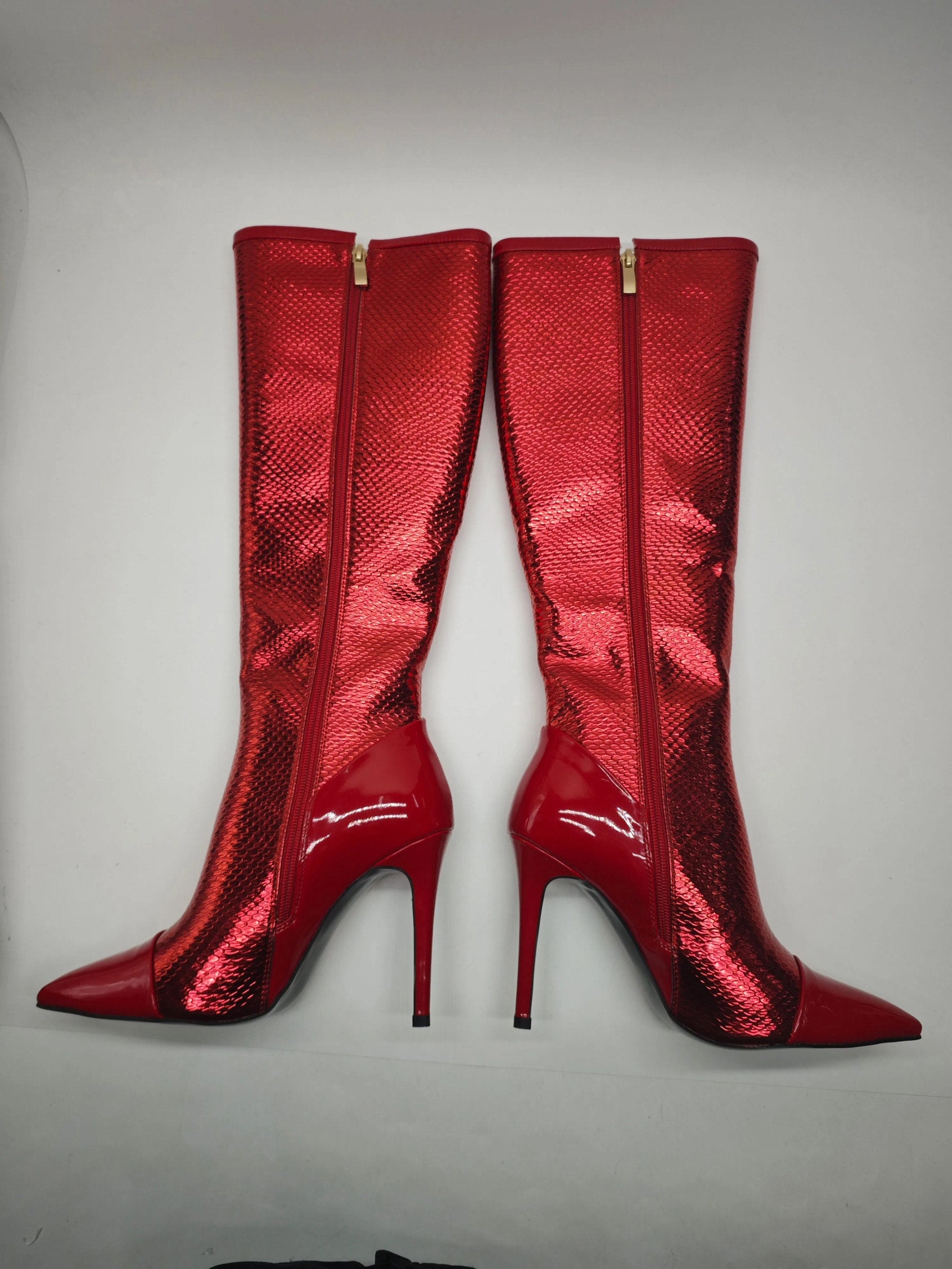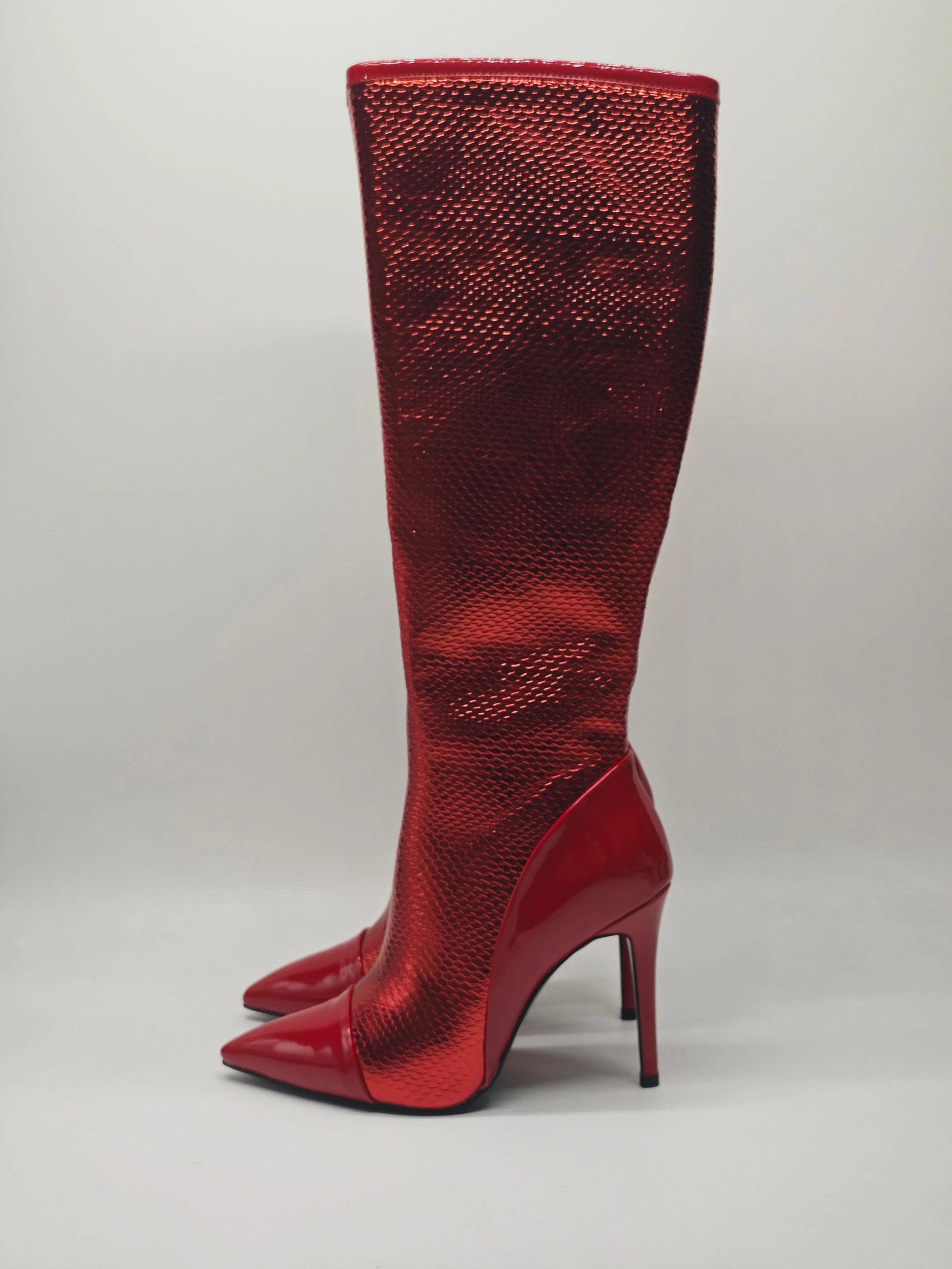 Command attention and exude confidence with the Rossario George Honey Red Stinger Boots. These statement-making boots redefine bold footwear with their vibrant metallic red finish and intricate honeycomb pattern, blending edgy sophistication with avant-garde luxury.