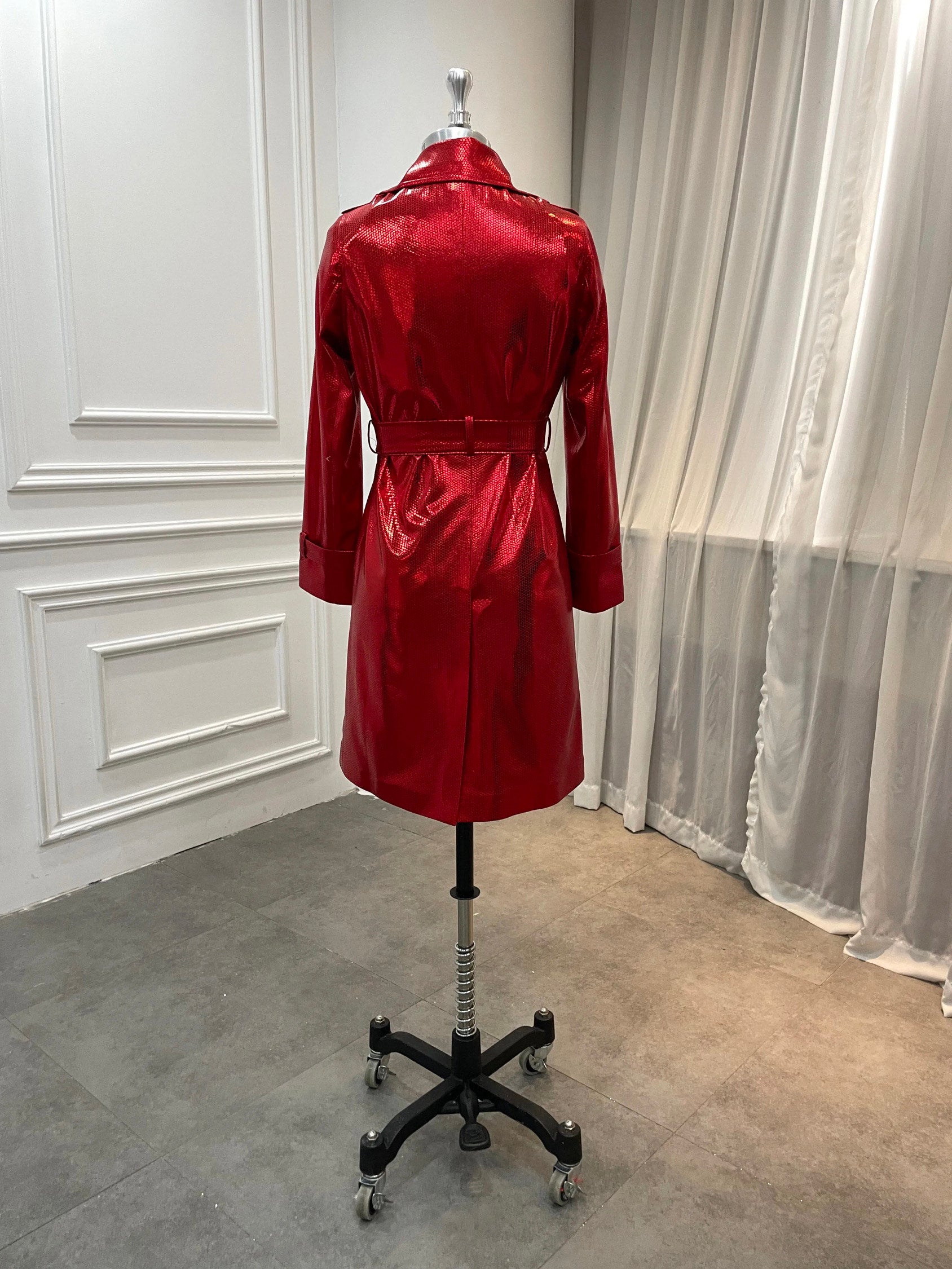 Make a bold statement with the Rossario George Metallic Red Honeycomb Trench Coat. This striking outerwear piece combines timeless trench coat styling with a modern, luxurious twist. Featuring a rich metallic red finish adorned with an intricate honeycomb pattern, this coat is a celebration of bold elegance and innovative design.
