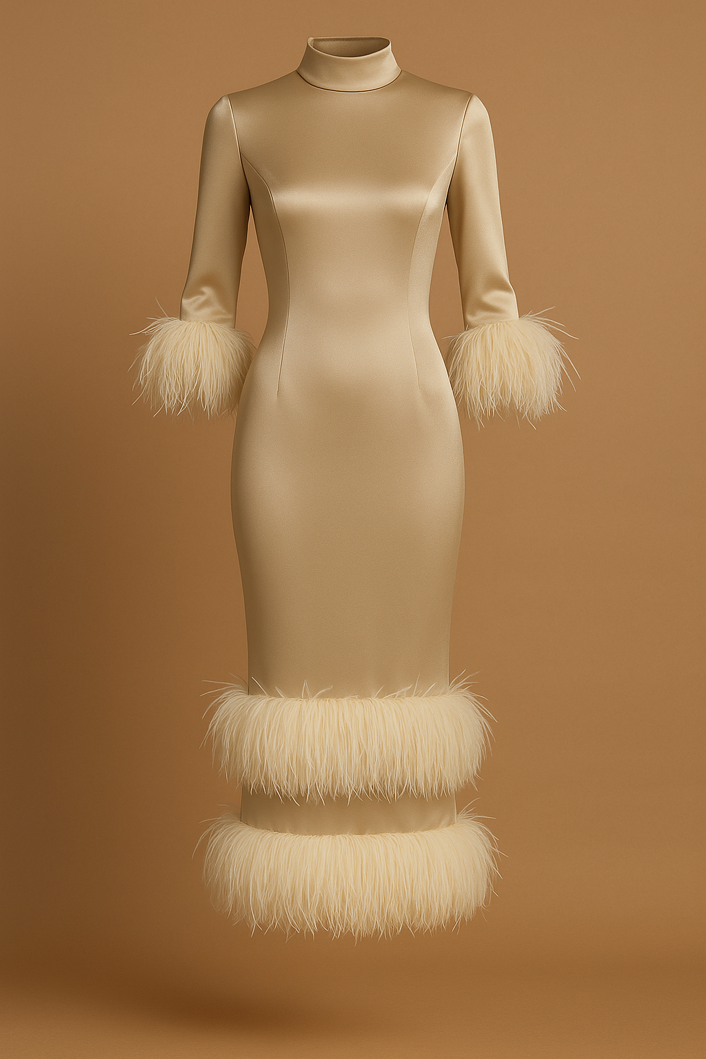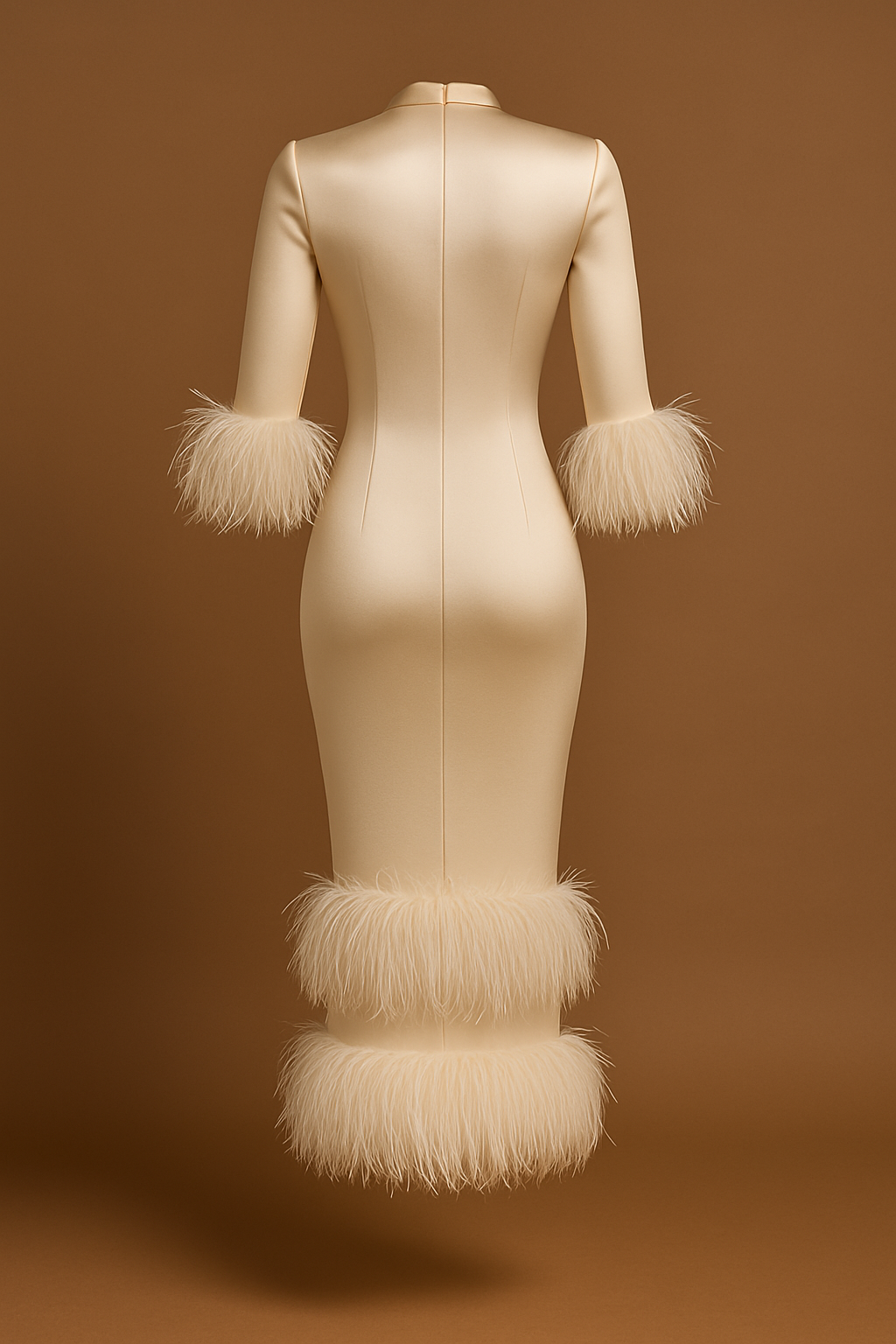 Accents of soft, hand-applied feathers at the cuffs and hem add a touch of ethereal drama, creating movement with every step and gesture. The high neckline and long sleeves lend an air of regal refinement, while the sculpted tailoring ensures a flattering, statuesque presence.