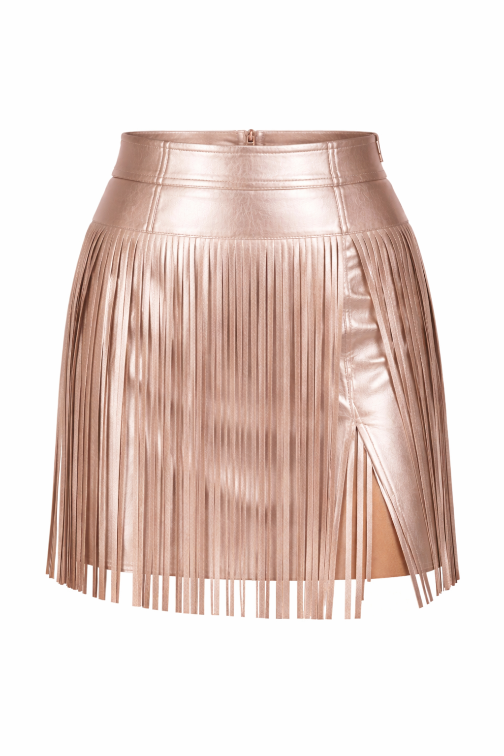 A structured high-waist silhouette sculpts the body while precision-cut fringe cascades from the hip, revealing subtle flashes of skin as you move. A clean side slit adds a touch of edge, balancing elegance with raw attitude. Whether styled with the matching metallic blouse or layered under a tailored jacket, this piece delivers impact from every angle.