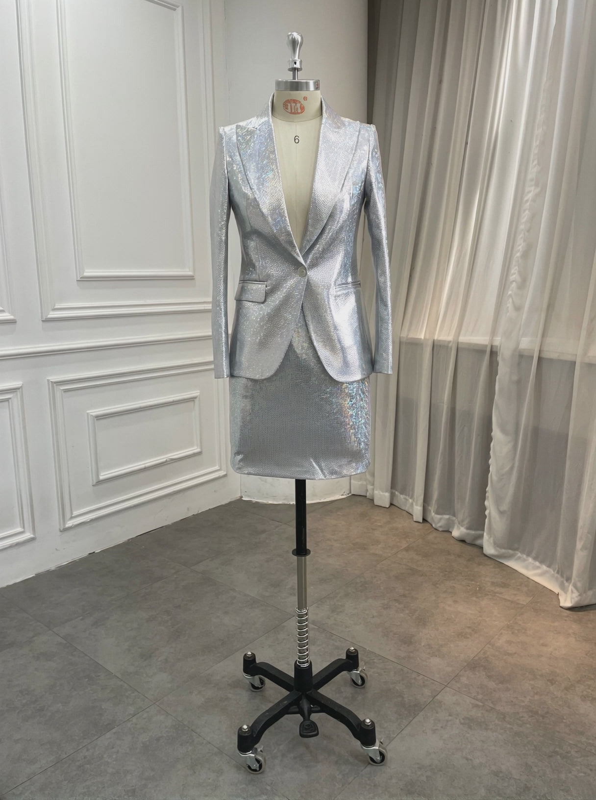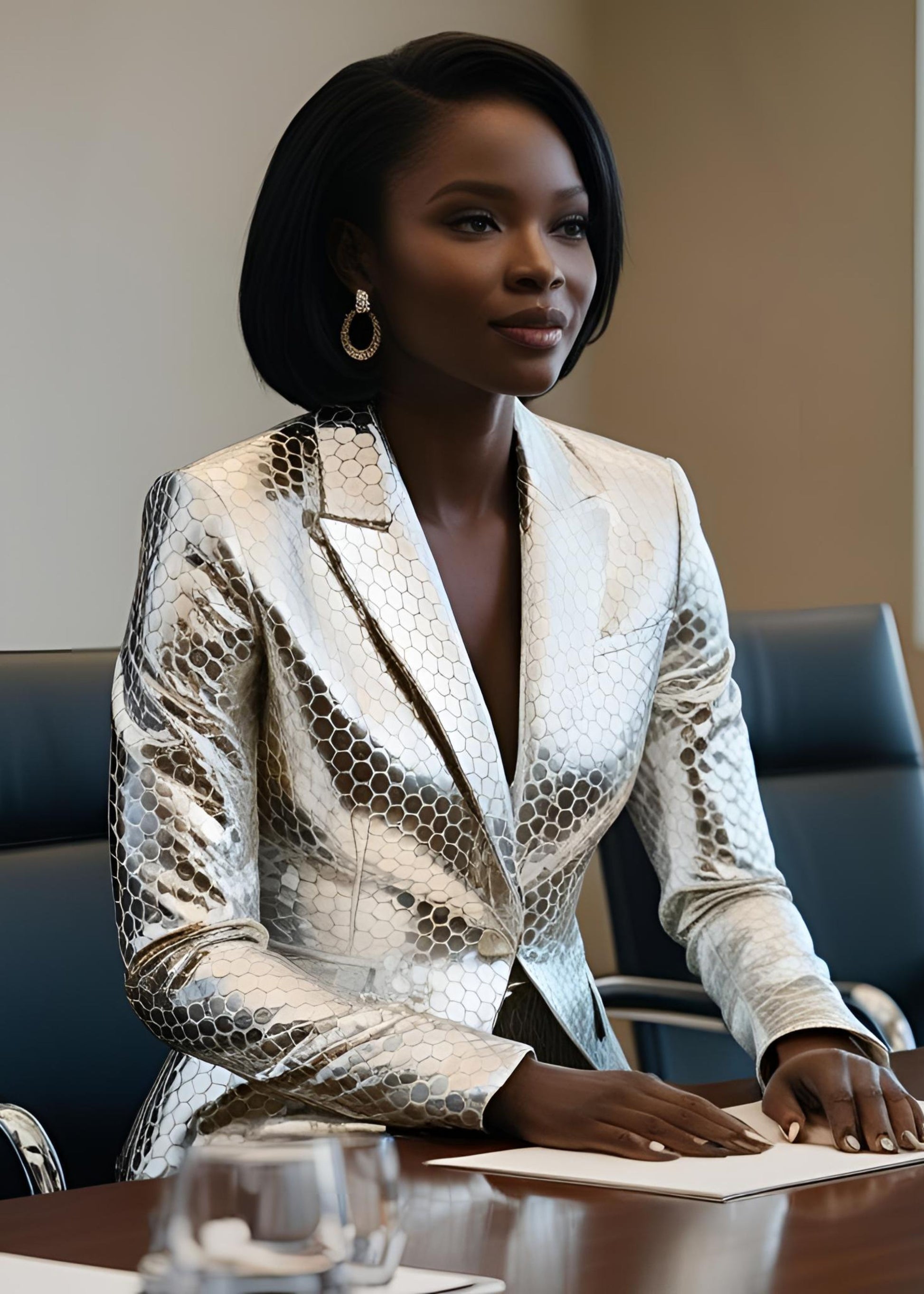 The tailored blazer features a structured silhouette with sharp lapels and a flattering, cinched waist, ensuring a commanding yet elegant presence. Choose your perfect pairing: sharply tailored pants for a sleek, elongated look, or a curve-skimming mini skirt for a daring edge.